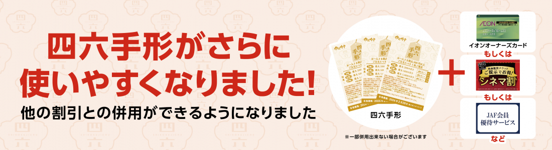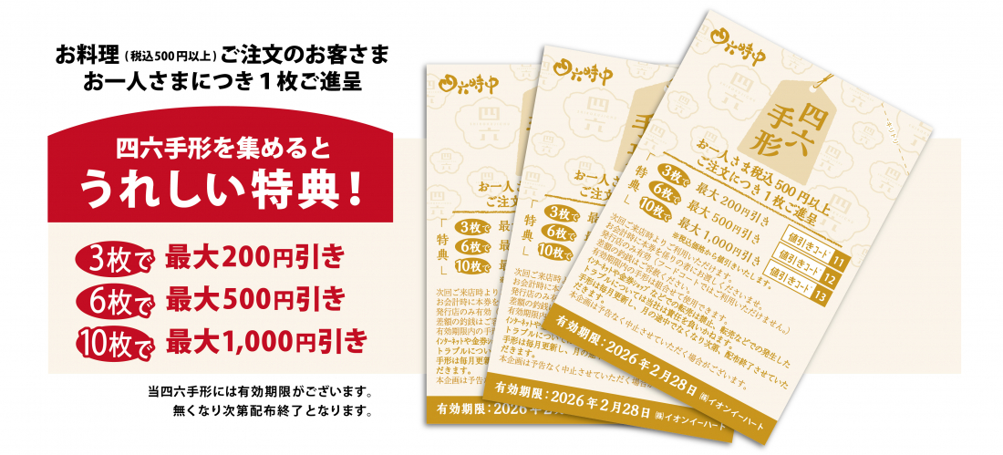 (※2)四六手形は特典枚数に応じてお会計時に税込価格より値引き。差額の釣銭はご容赦ください。