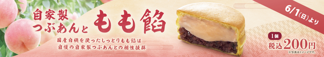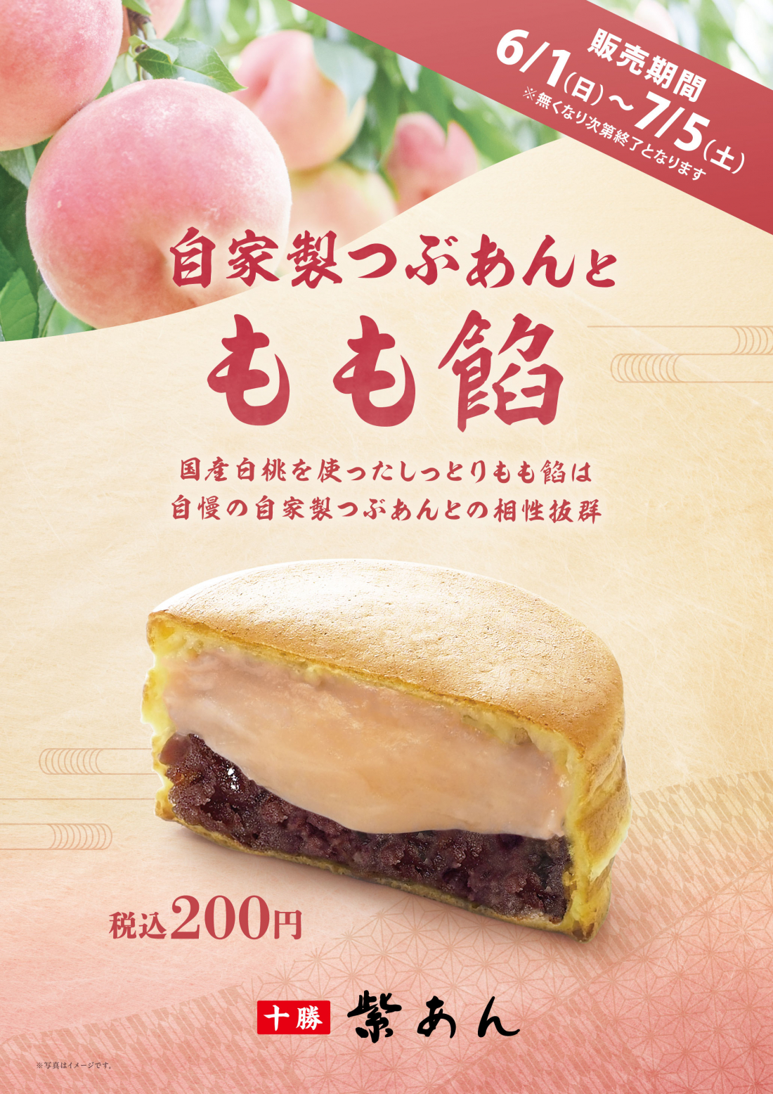 紫あんでは毎月季節の限定商品を販売しております。 6月は、国産白桃の「もも餡」と自家製つぶあんを組み合わせた大判焼を販売いたします。 国産の白桃を原材料とした“もも餡”は、白桃本来のまろやかな甘さと芳醇な香りが特徴で、『紫あん』の甘さ控えめのつぶあんとの相性も抜群です。ご自身のおやつとしてはもちろん、親しい方への手土産にも最適な一品となっております。