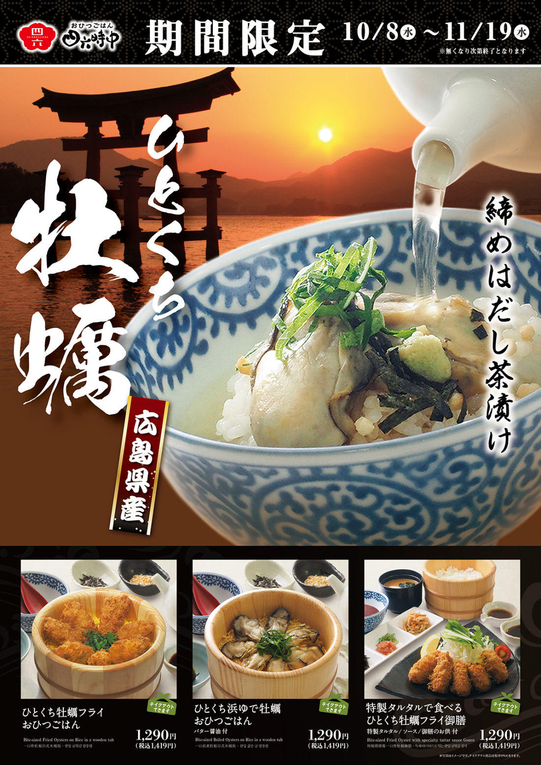 サクッとした食感がたまらない牡蠣フライをおひつごはんにトッピングした「ひとくち牡蠣フライおひつごはん」をはじめ、浜ゆでした牡蠣にバター醤油を絡めた「ひとくち浜ゆで牡蠣おひつごはん」、さらに定番の「特製タルタルで食べるひとくち牡蠣フライ御膳」と、「牡蠣」を思う存分満喫いただけるラインナップを取り揃えました。締めは、当店自慢の特製だしを注いで「だし茶漬け」として召しあがっていただくことで牡蠣の旨みが一層引き立ち、最後まで飽きることなくお愉しみいただけます。