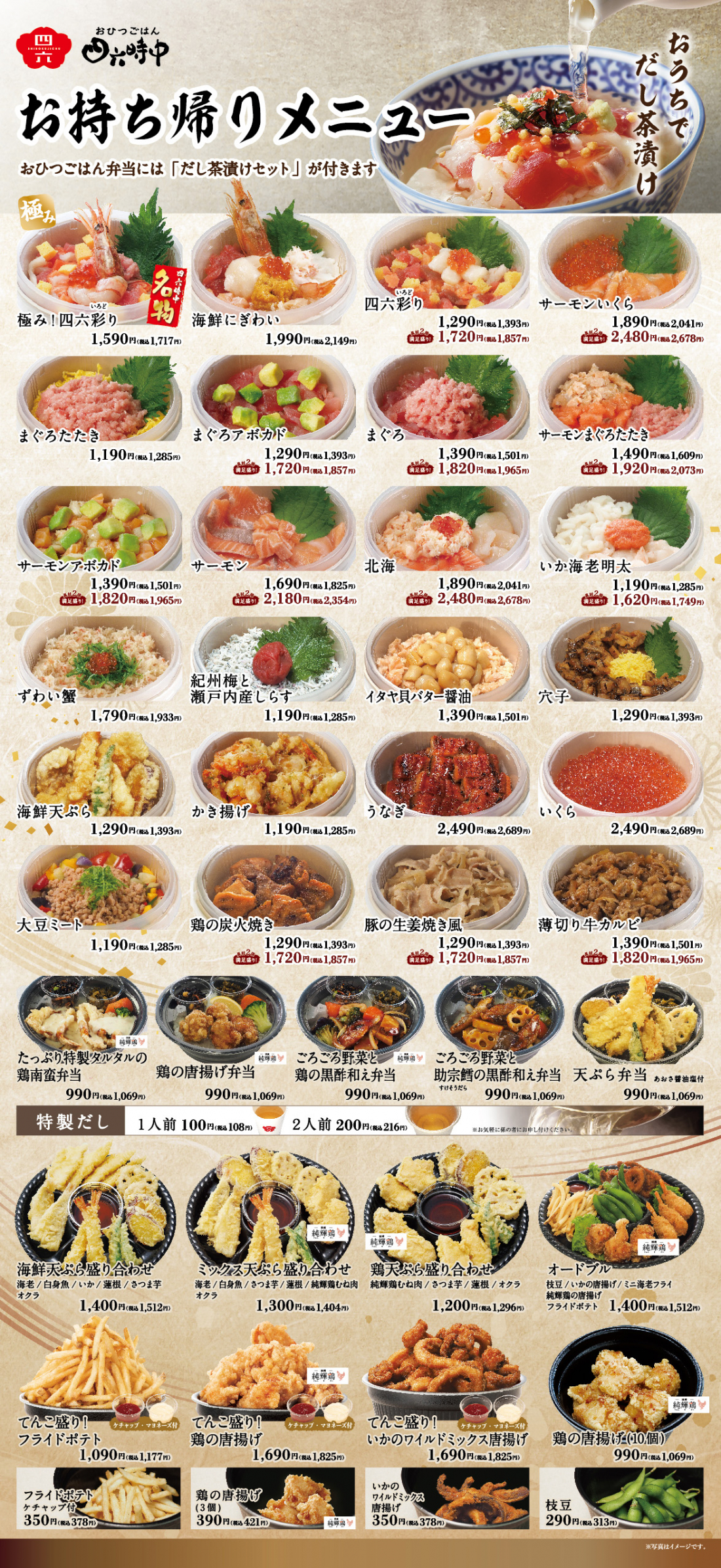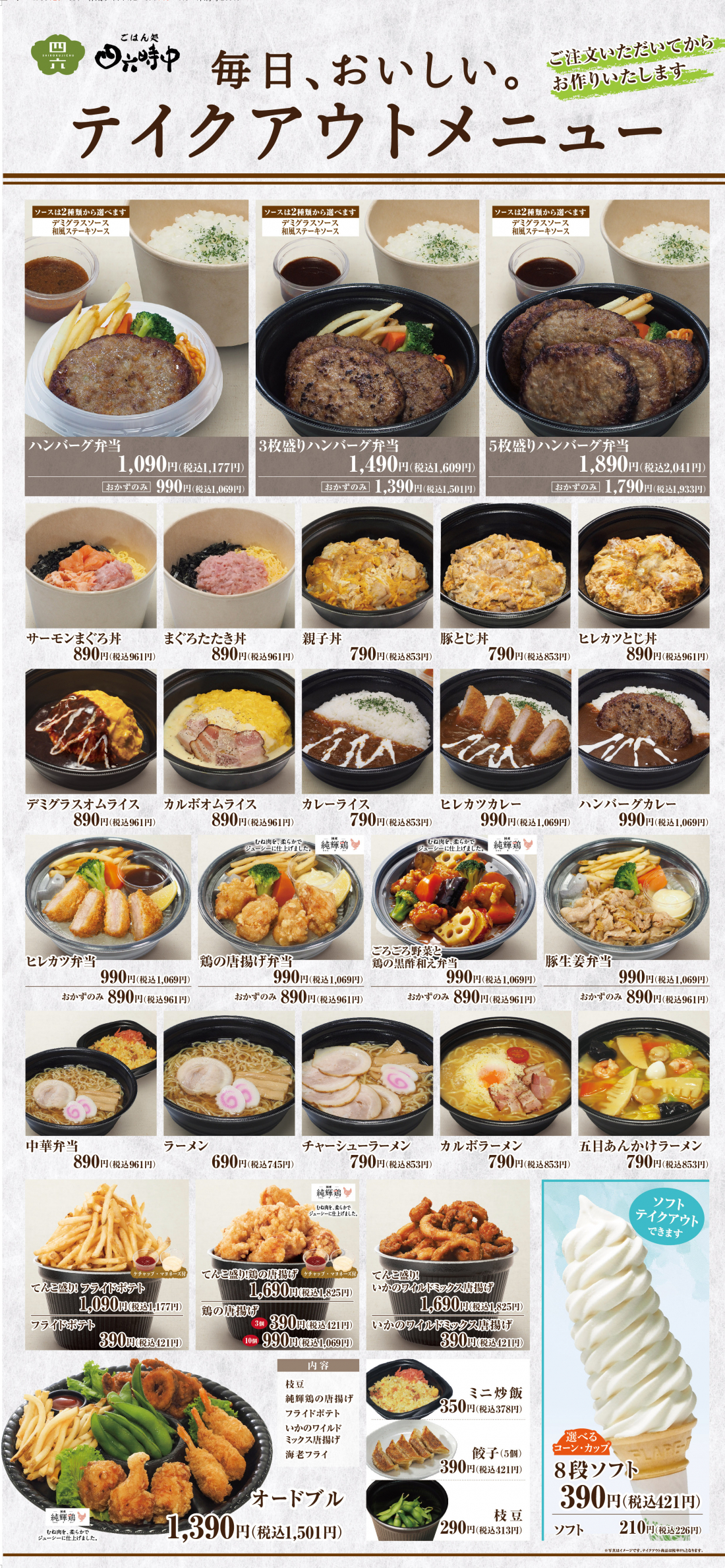 ※「おひつごはん四六時中」の一部の店舗は上記と異なるメニューを提供させて頂いております。各店舗詳細ページよりメニューをご確認ください。該当店舗はこちらよりご確認ください。